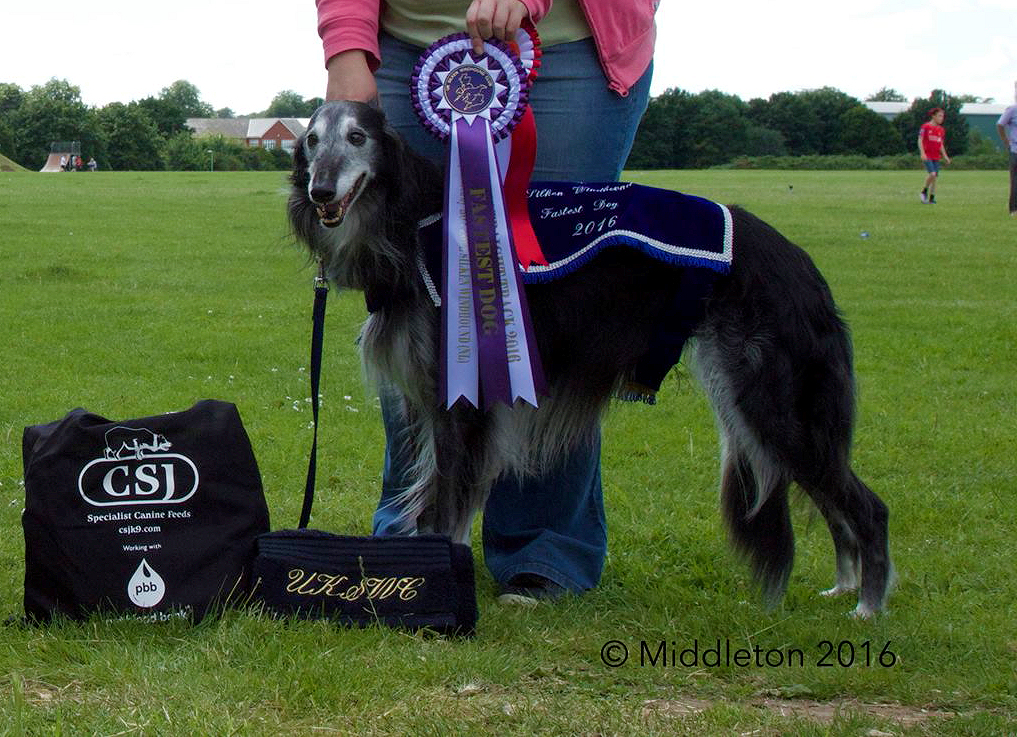 Es hat mich immer fasziniert, wie er in jeder Situation gelassen und cool blieb. Selbst in großem Trubel immer ein kleines Fleckchen fand um sich mit einem scheinbaren Axelzucken nieder zu legen, als wenn ihn das Alles nicht beeindruckte. Auch auf einem großen Windhundrennen, um ihn herum viele bellende Hunde, und den Hasenzug nicht weit entfernt vor Augen, er so gelassen und ruhig blieb, dass wir schon betrübt dachten "der läuft heute nicht". Aber wehe es wurde ernst, dann war er da, zu 100%. Konzentriert und hochmotiviert. Sogar in einem Alter von 7 Jahren noch so schnell, dass er die komplette (extrem starke und junge) Konkurrenz hinter sich lies.